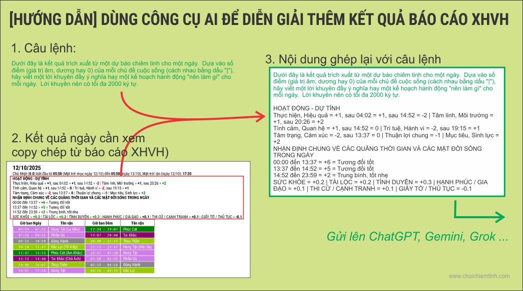 Với một số người thì việc đọc kết quả "rút gọn" này không thành vấn đề và họ chỉ cần như vậy. Nhưng nếu bạn là một trong những người khác cần lời giải thích cặn kẽ hay mong muốn được diễn giải rõ ràng hơn giống như một "chiêm tinh gia" hay "life coacher" (người khai vấn, cct.tips/khaivan) cho riêng mình thì bạn có thể dùng một công cụ AI phổ biến hiện nay và hoàn toàn MIỄN PHÍ như ChatGPT, Google Gemini hay Grok v.v... để diễn giải, mở rộng thêm nội dung cho ngày cần muốn xem trong báo cáo XHVH.